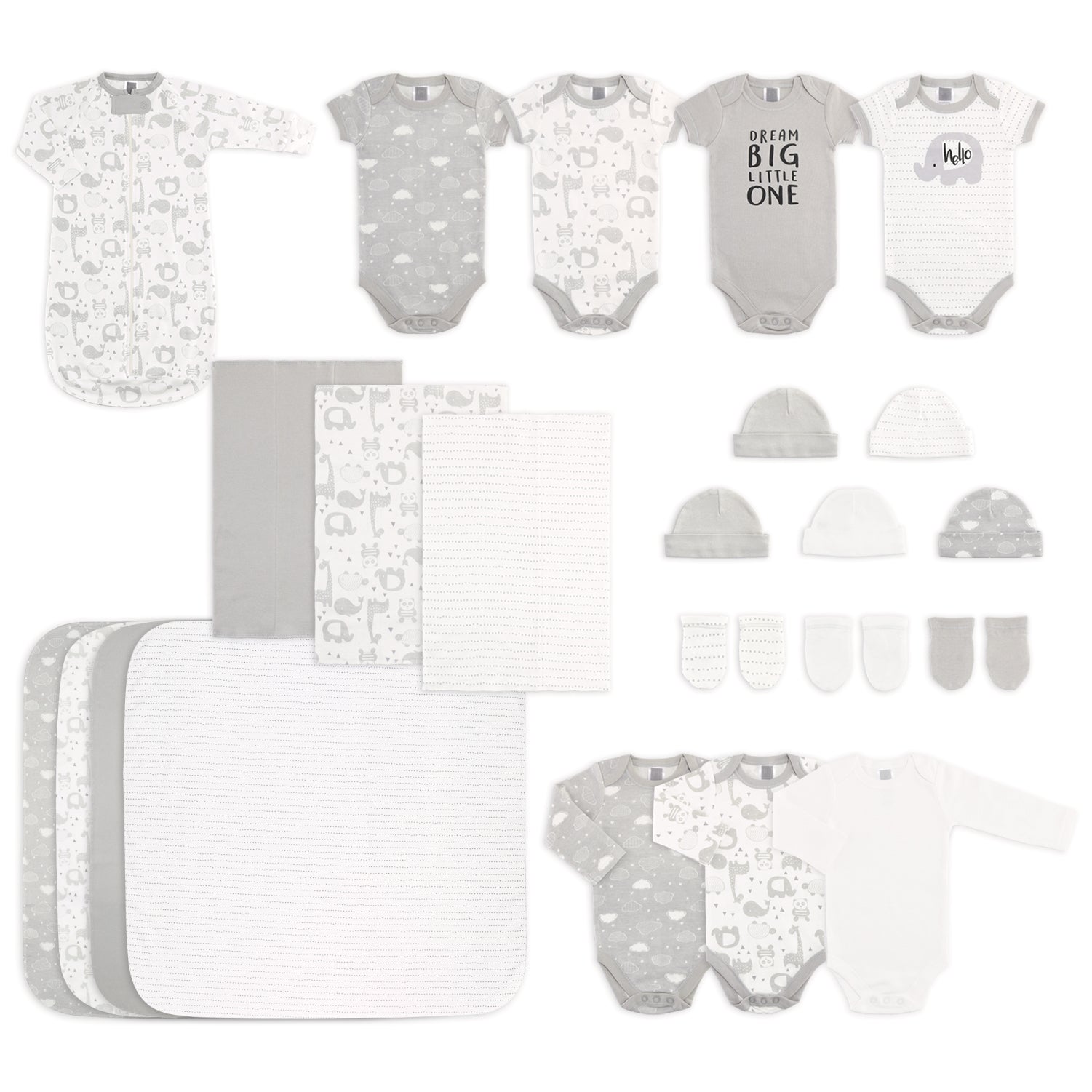 As a collection of essentials and accessories for baby, this 23-piece Layette Set in Grey from The Peanutshell gives you the must haves for every day and more! The set includes a combination of neutral solid in grey and ivory, as well as three graphic prints of puffy clouds, a dotted stripe, and a sweet animal design that tie the collection together. The collection includes everyday essentials like 3 long sleeve and 4 short sleeve bodysuits featuring a screen print elephant character and a sweet catchphrase "Dream Big Little One". A grey and ivory animal print sleep sack unzips easily for a little nap or nighttime slumber. For your on-the-go activities, 4 super-soft cotton flannel receiving blankets and 3 cotton knit burp cloths are included - perfect for swaddles, snuggles and spit ups. The finishing touch for baby is in the accessories: 3 pairs of mittens in prints and solids and 5 coordinating beanies keep tiny hands and head covered and cozy. With so many options, this set goes beyond the basics to create countless mix-and-match combinations for a girl, boy or both!