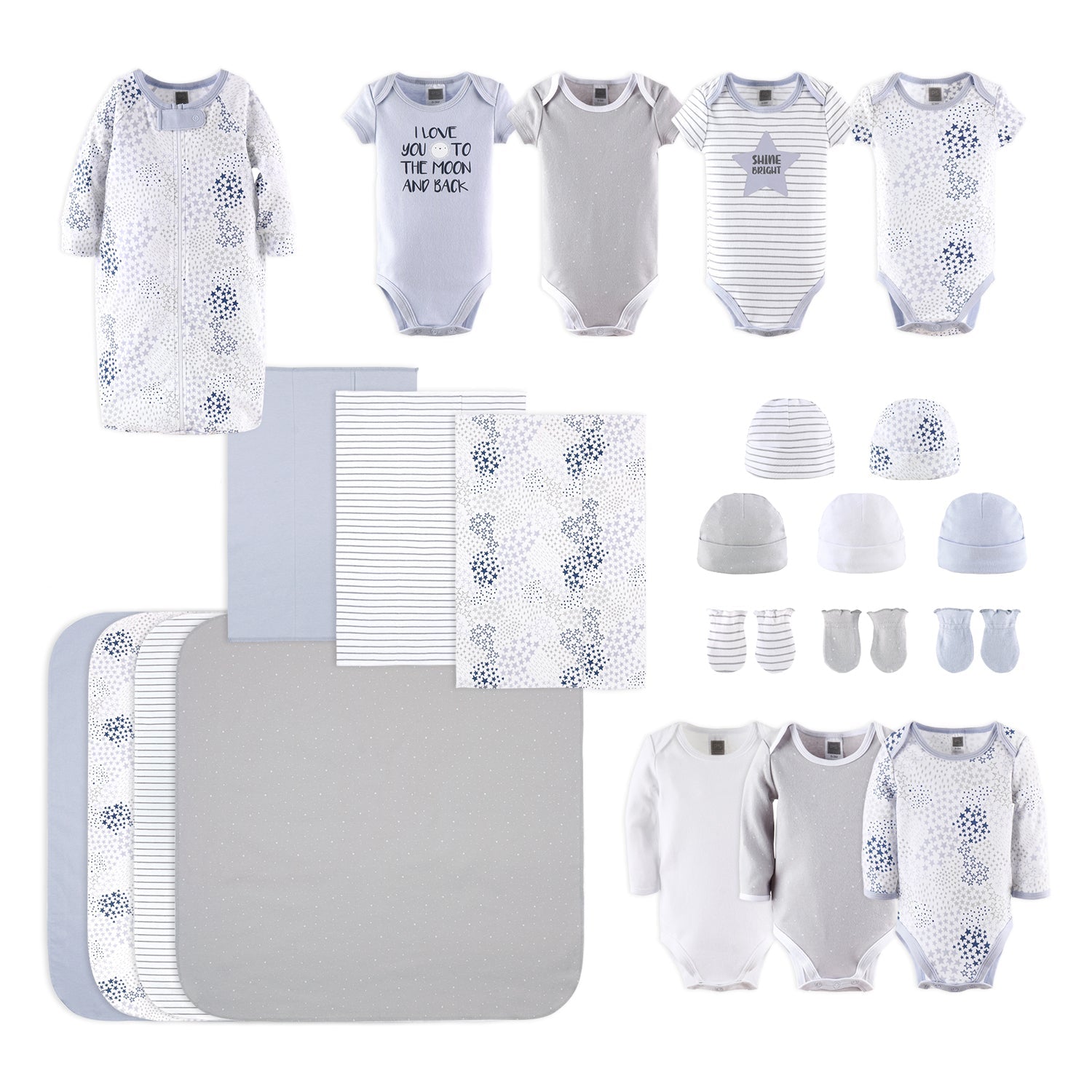 • Set includes: 1 sleep bag, 4 short-sleeved bodysuits, 3 long-sleeved bodysuits, 5 beanies, 3 sets of mitten, 3 burp cloths, and 4 receiving blankets.
