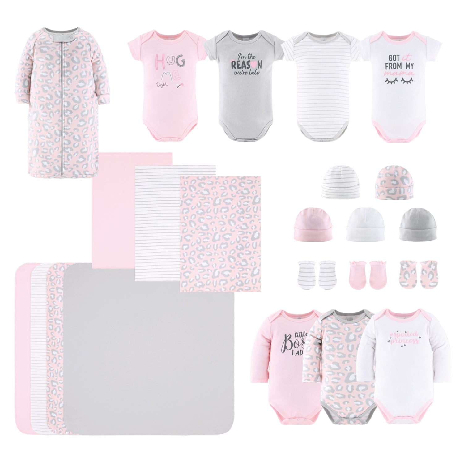 • Set includes: 1 sleep bag, 4 short-sleeved bodysuits, 3 long-sleeved bodysuits, 5 beanies, 3 sets of mitten, 3 burp cloths, and 4 receiving blankets.