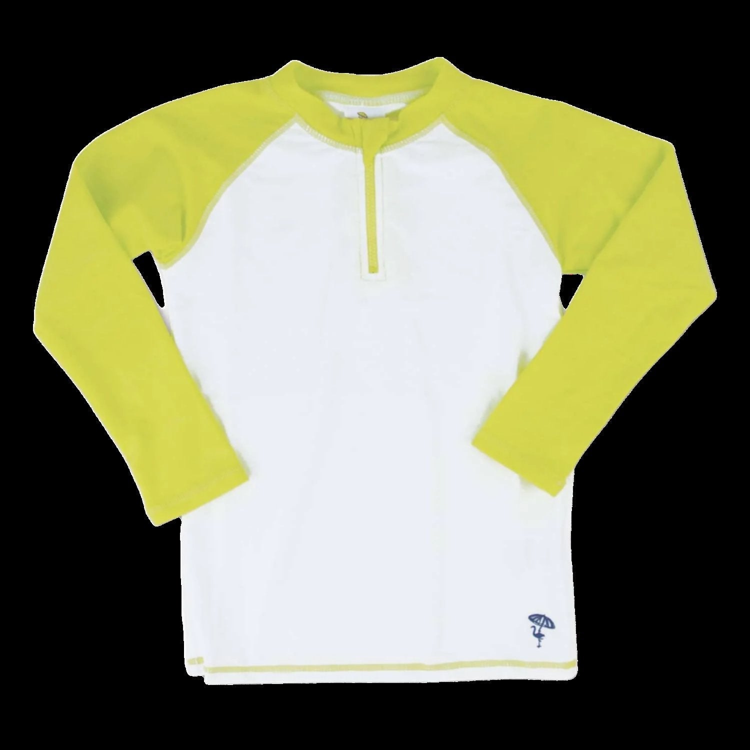 Shade Critters Rash Guard with Water Appearing Fabric for Boys. White Body with light blue arms featuring Sharks that appear when exposed to water. Sun Protective Fabrics with a UPF50+ rating (UV50).